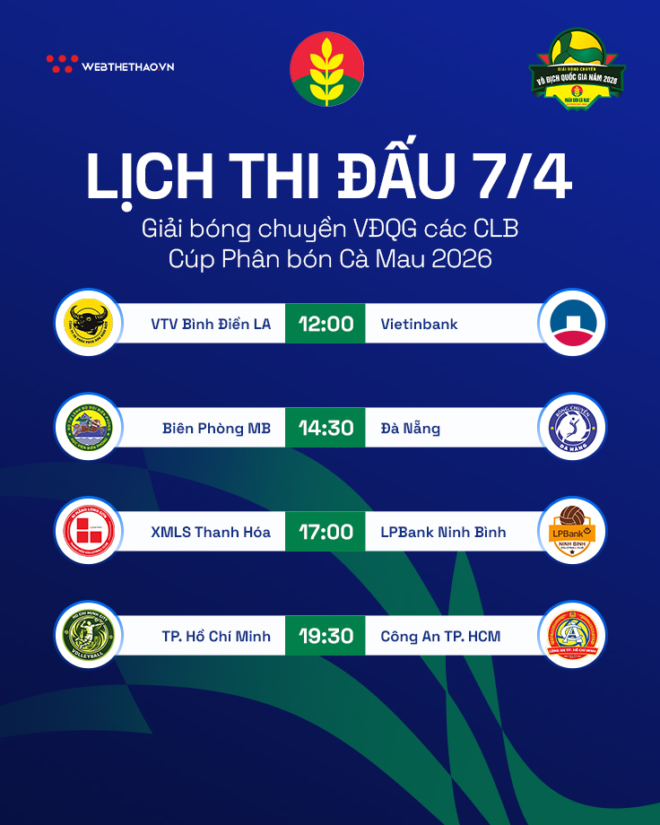 Ngày thi đấu 7/4 tại giải bóng chuyền VĐQG 2026 cúp Phân bón Cà Mau tiếp tục mang đến loạt trận hấp dẫn ở cả nội dung nam và nữ, trong đó tâm điểm là màn tái hiện chung kết cúp Hoa Lư.
