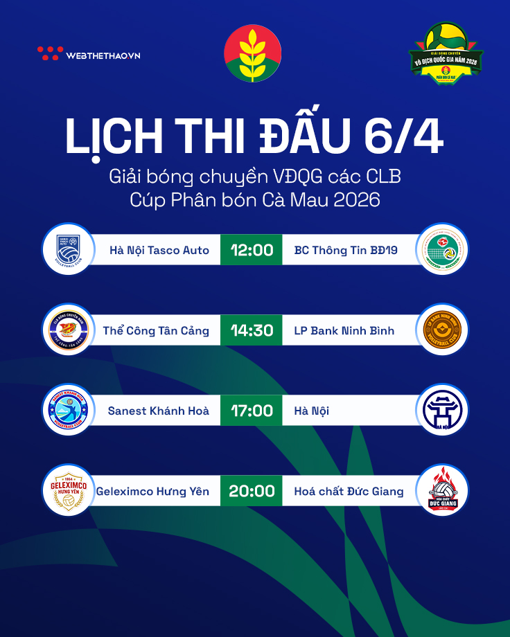 Ngày thi đấu 6/4 của giai đoạn 1 giải bóng chuyền VĐQG 2026 cúp Phân bón Cà Mau hứa hẹn mang đến những màn so tài kịch tính ngay từ đầu khi hàng loạt cặp đấu được đánh giá khá cân bằng.