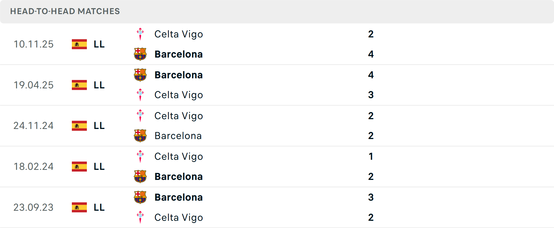 Barcelona đang thống trị cuộc đua vô địch La Liga với 79 điểm sau 31 vòng đấu, tạo ra khoảng cách 9 điểm rất an toàn với Real Madrid. Thầy trò Hansi Flick đang hướng tới chiến thắng thứ 8 liên tiếp tại giải quốc nội sau khi vừa vùi dập Espanyol 4-1. Dù mới phải dừng bước tại Champions League, đội chủ sân Camp Nou vẫn cho thấy sự áp đảo ở quốc nội nhờ hỏa lực mạnh mẽ, minh chứng là việc ghi tới 8 bàn vào lưới Celta Vigo trong hai lần đối đầu gần nhất.