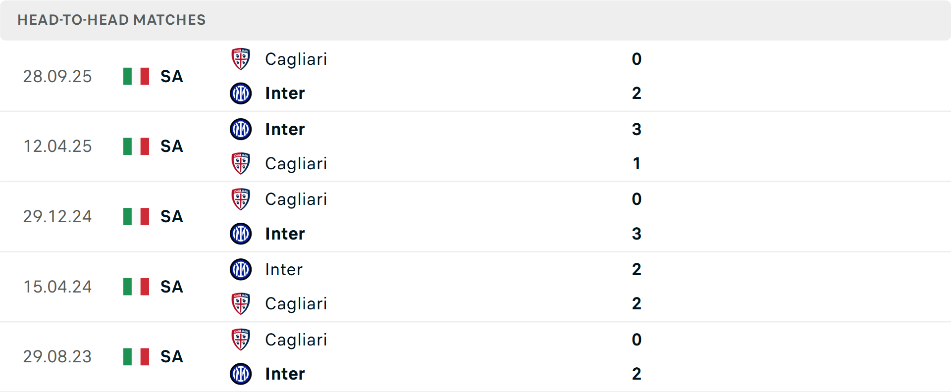 Tổng bàn thắng cả trận: 7/9 cuộc trận gần đây của Inter Milan dưới mốc tổng bàn thắng, tương tự là 2/3 trận vừa qua của Cagliari.