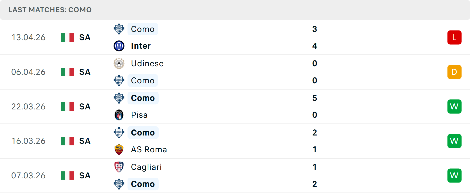 Phía bên kia, Como đang trải qua giai đoạn đầy áp lực trong cuộc đua giành vé dự Champions League. Đội quân của Cesc Fabregas vừa có hai trận đấu không như ý khi chỉ giành vỏn vẹn 1 điểm kể từ sau loạt trận quốc tế. Đặc biệt, trận thua ngược 3-4 trước Inter Milan dù đã dẫn trước 2 bàn cho thấy bản lĩnh của Como ở những thời điểm quyết định vẫn là dấu hỏi lớn. Với việc kém Juventus 2 điểm, Como buộc phải giành chiến thắng nếu không muốn hụt hơi trong cuộc đua top 4.