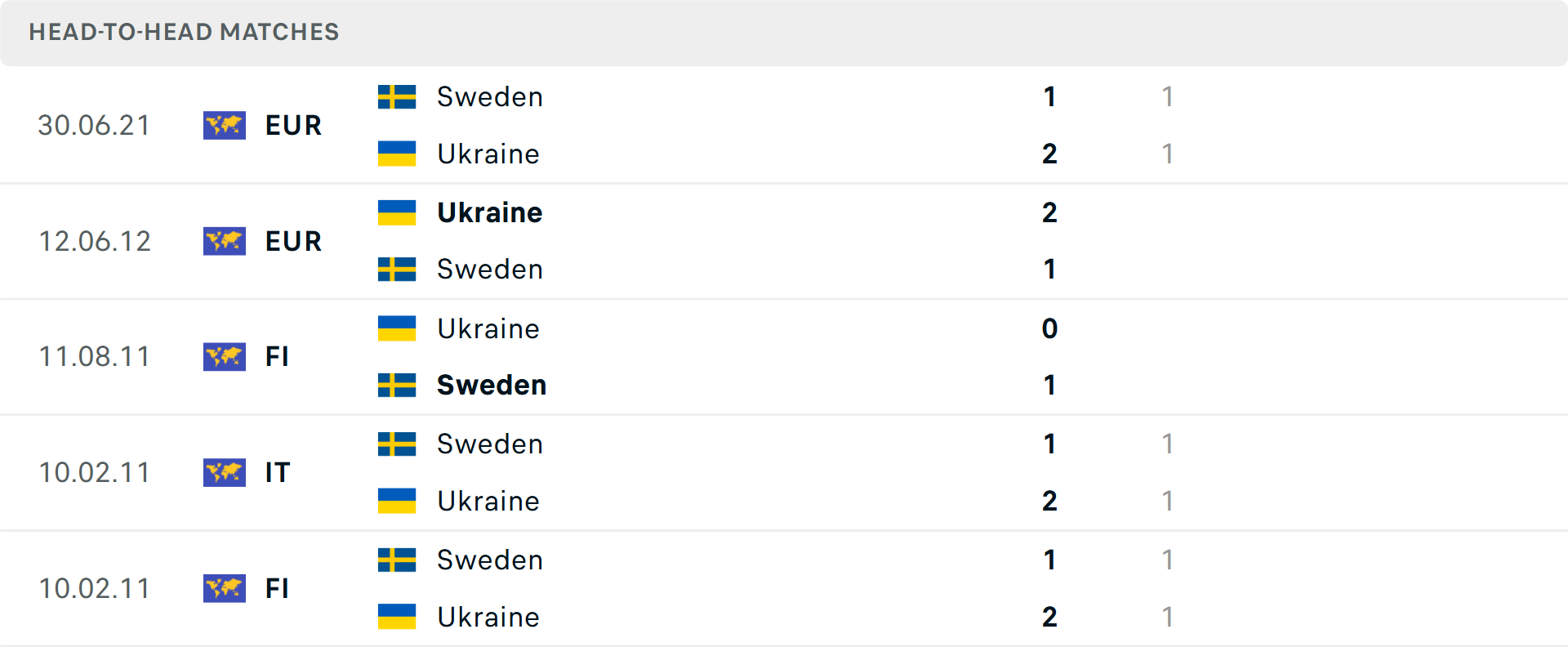 Tổng bàn thắng cả trận: 3/6 trận gần đây của Ukraine dưới mốc tổng bàn thắng, tương tự là 4/5 trận vừa qua của Thuỵ Điển.