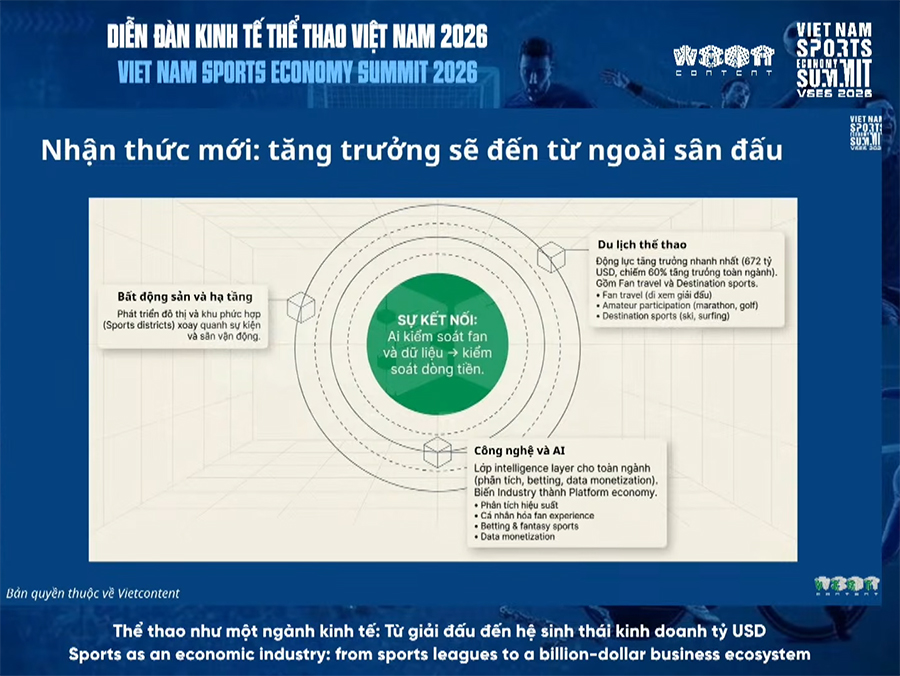 Một góc nhìn đột phá về phát triển thể thao cho thấy, các yếu tố thúc đẩy sự tăng trưởng đôi khi không đến từ bên trong chuyên môn ngành, mà đến từ các lực đẩy ngoại vi. Có ba đòn bẩy lớn nhất hiện nay: hạ tầng bất động sản, du lịch và Công nghệ cùng AI.
