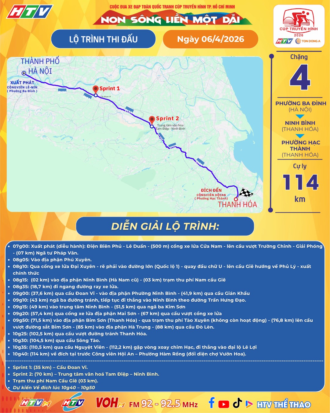 Ngày 6-4, đoàn đua rời Hà Nội để bắt đầu chặng 4 từ phường Ba Đình (Hà Nội) và kết thúc tại Thanh Hóa. Với tổng lộ trình 114km, đây là chặng đua dài nhất tính từ đầu giải, đòi hỏi các tay đua phải có sự chuẩn bị kỹ lưỡng về thể lực và chiến thuật tiếp tế.