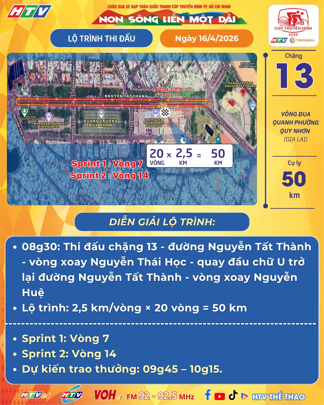 Trực tiếp đua xe đạp Cúp truyền hình TPHCM 2026 hôm nay. Link xem trực tuyến chặng 13 Cúp truyền hình TPHCM 2026 có lộ trình quanh phường Quy Nhơn (Gia Lai), cự ly dài 50km.