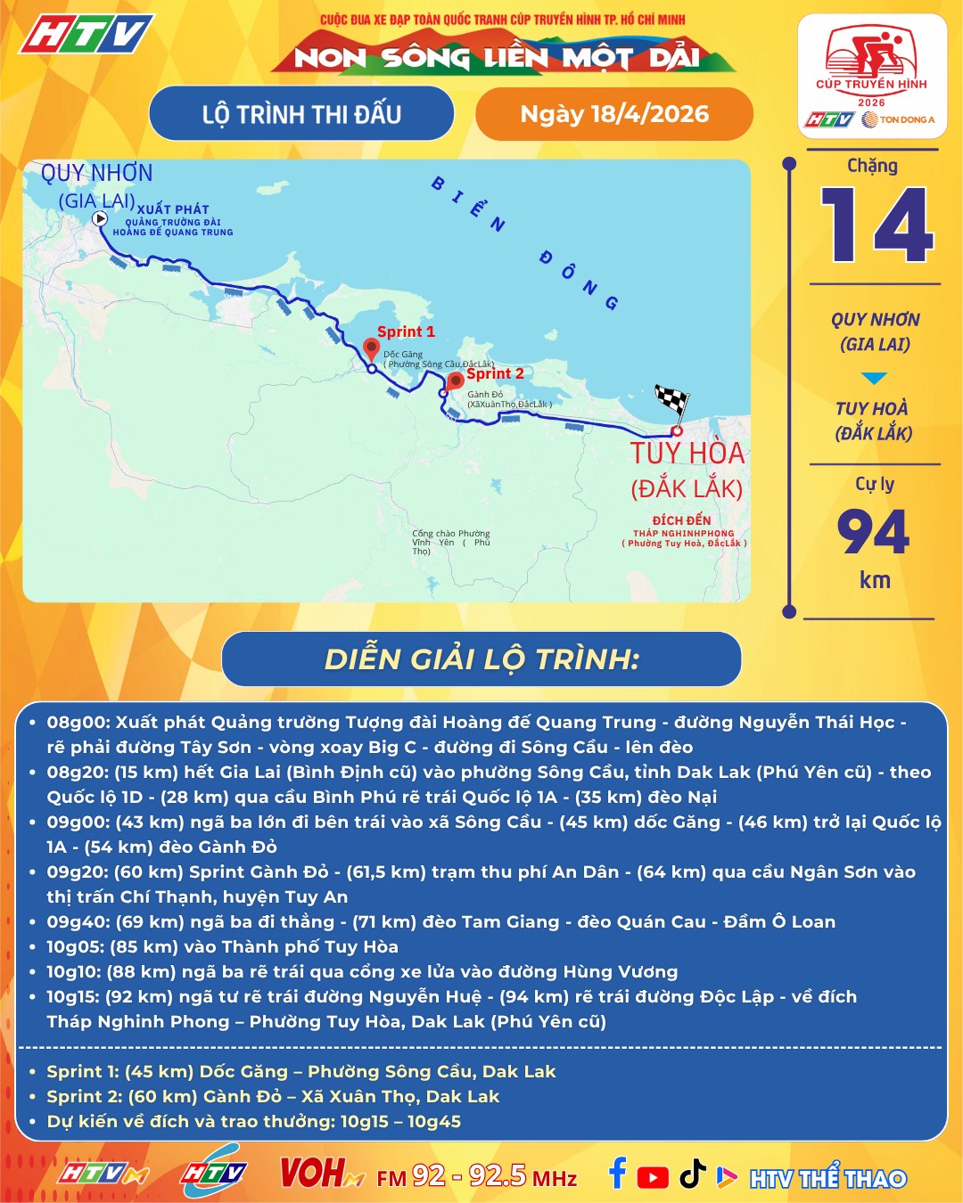 Sau khi tạm nghỉ vào ngày 17/4 thì đến sáng ngày 18/4, đoàn đua tiếp tục hành trình chặng 14 với lộ trình từ Quy Nhơn đi Tuy Hòa. Với cự ly 94km và địa hình tương đối bằng phẳng, đây được dự báo là "sân khấu" lý tưởng để các chuyên gia tốc độ phô diễn sức mạnh. Khả năng đoàn đua sẽ đẩy tốc độ lên rất cao ngay từ sau vạch xuất phát, biến chặng đường về Đắk Lắk trở thành một cuộc chiến thể lực và chiến thuật ở tốc độ cao.