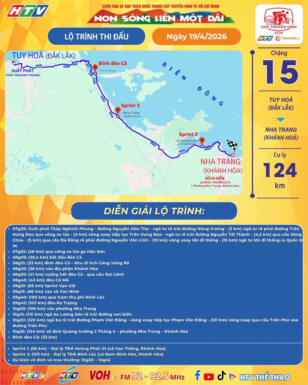 Ngày 19/4, các tay đua sẽ tiếp tục hành trình chặng 15 với cự ly 124km từ Tuy Hòa đi Nha Trang. Tâm điểm của chặng này chính là việc chinh phục đèo Cả – một trong những ngọn đèo thử thách nhất của giải.