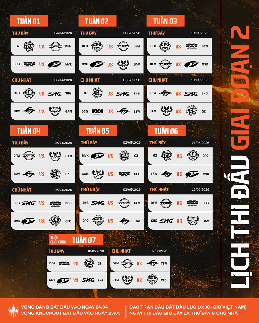 Giai Đoạn 2 của LCP sẽ khởi tranh vào ngày 04.04 và kéo dài đến ngày 07.06.2026. Sau đây là lịch thi đấu của Mùa Giải Chính.